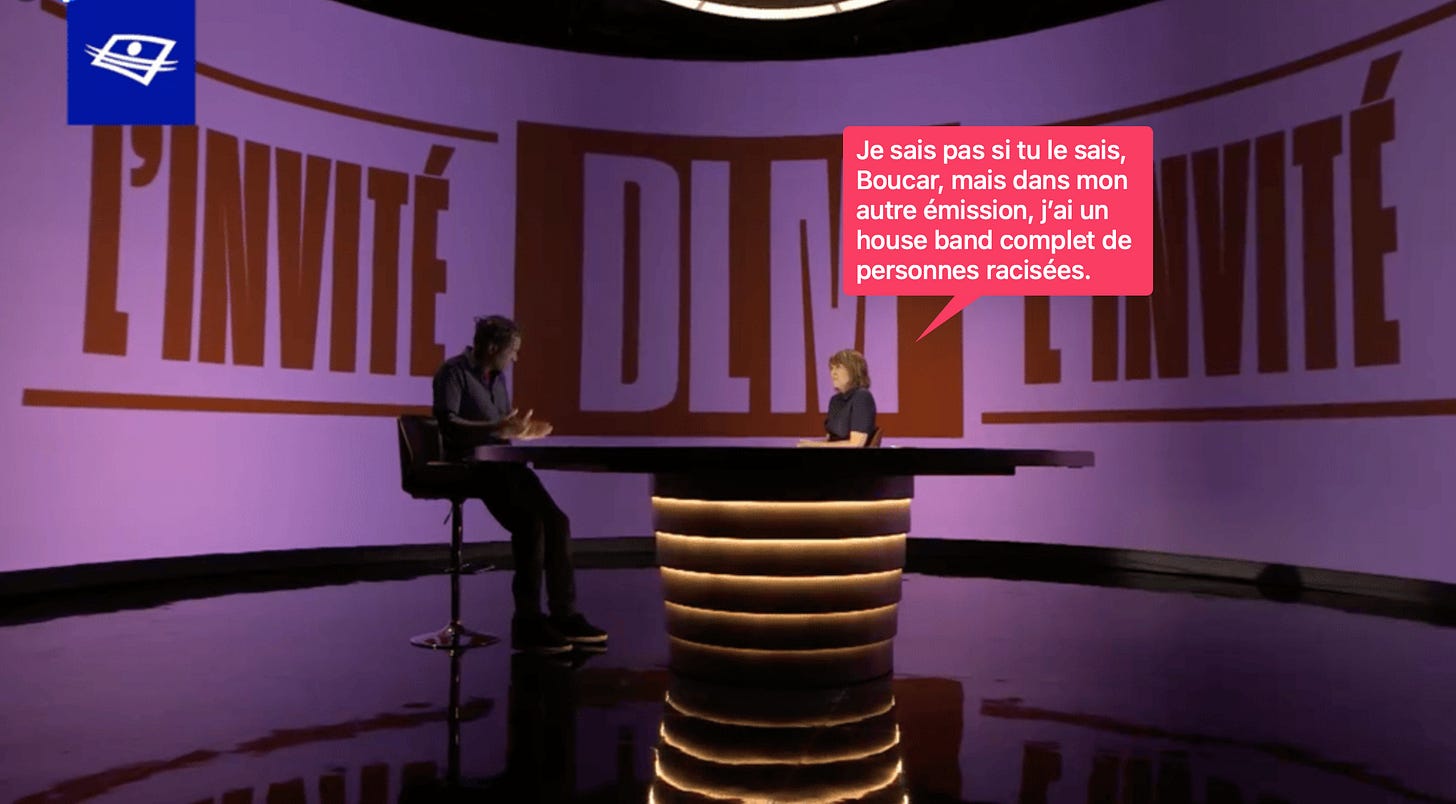 Un autre moment très parlant (et cocasse) est survenu lors de l’interview avec Boucar Diouf à Dans les médias, l’autre émission dirigée par Marie-Louise Arsenault.