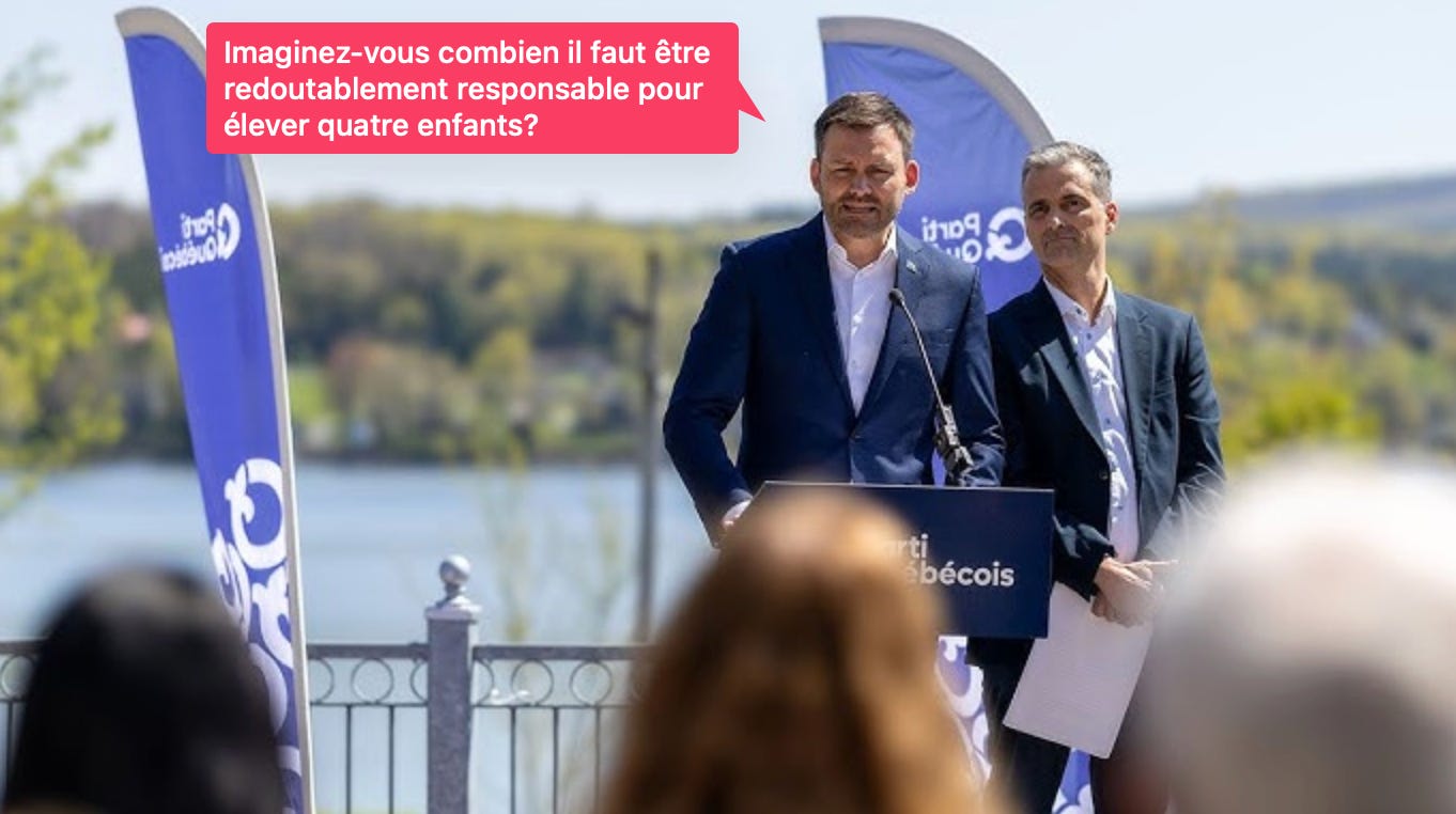 Comme c’est clairement un compté conservateur, on voit PSPP insister beaucoup trop fort sur combien Boissonneault est un bon candidat parce qu’il est un père de famille de quatre enfants. L’image ô combien sacré du bon vieux père de famille, comme dans les bonnes années de Duplessis.