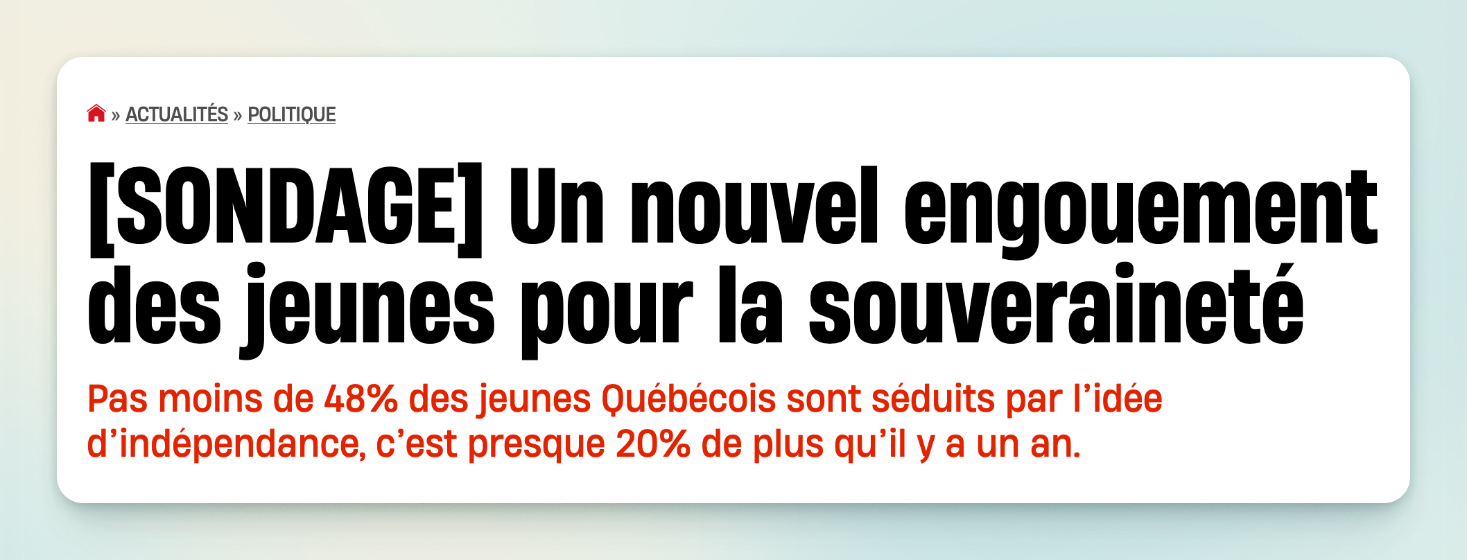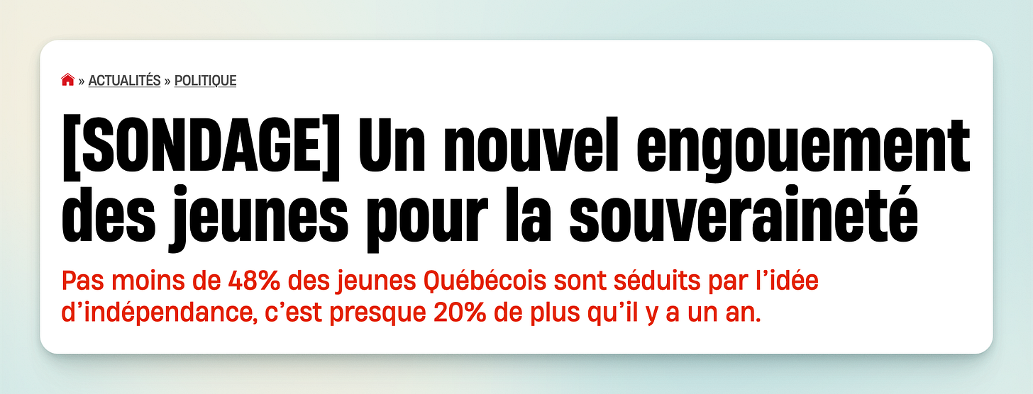 Tout d’abord, la meilleure nouvelle depuis longtemps : Léger sort un sondage où 48% des 18-34 ans seraient rendus pour le OUI.